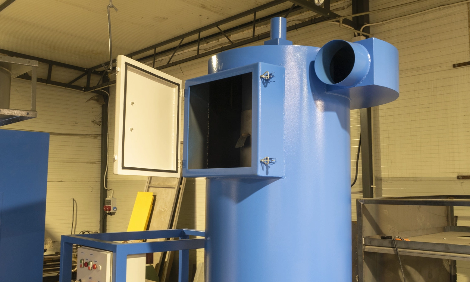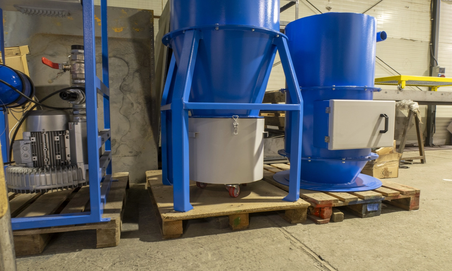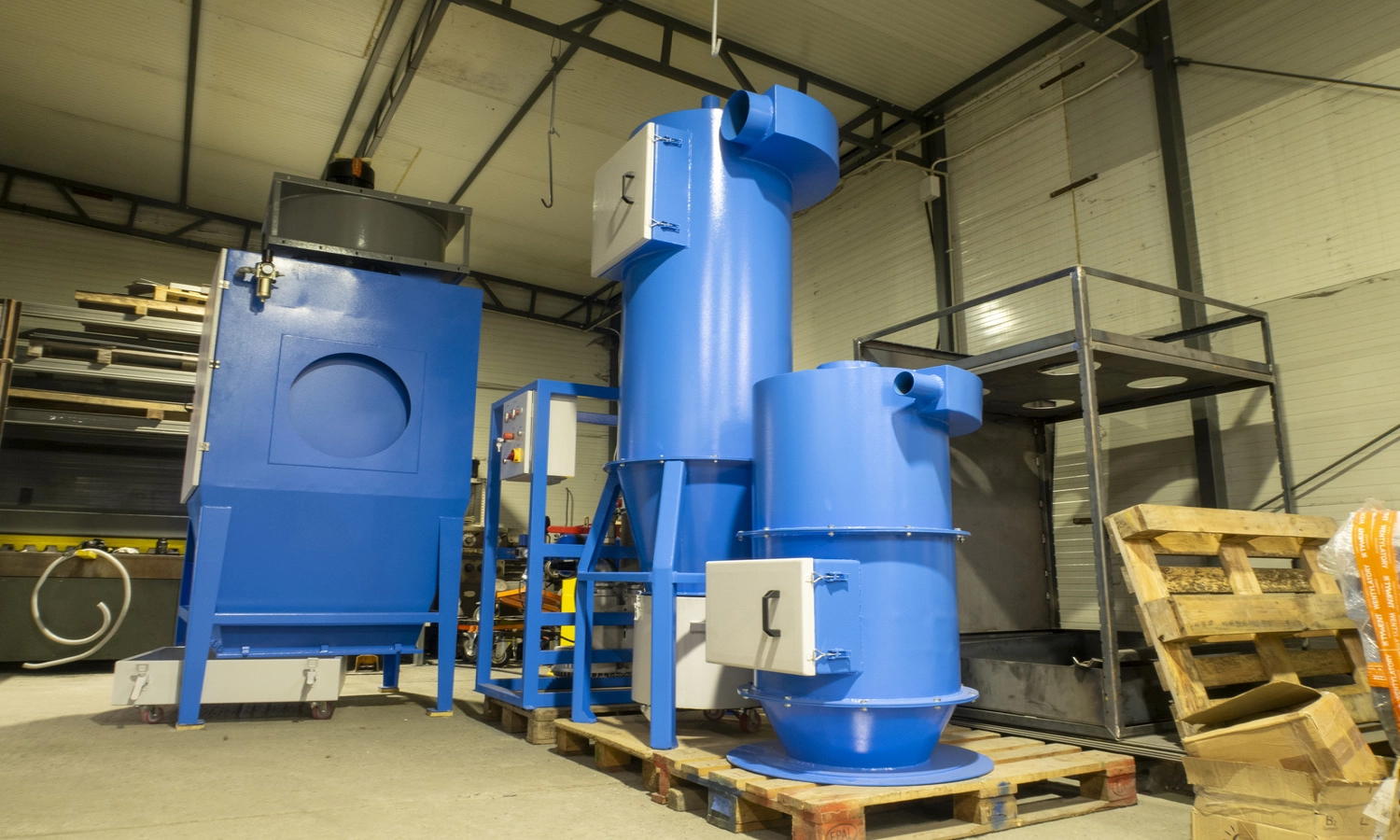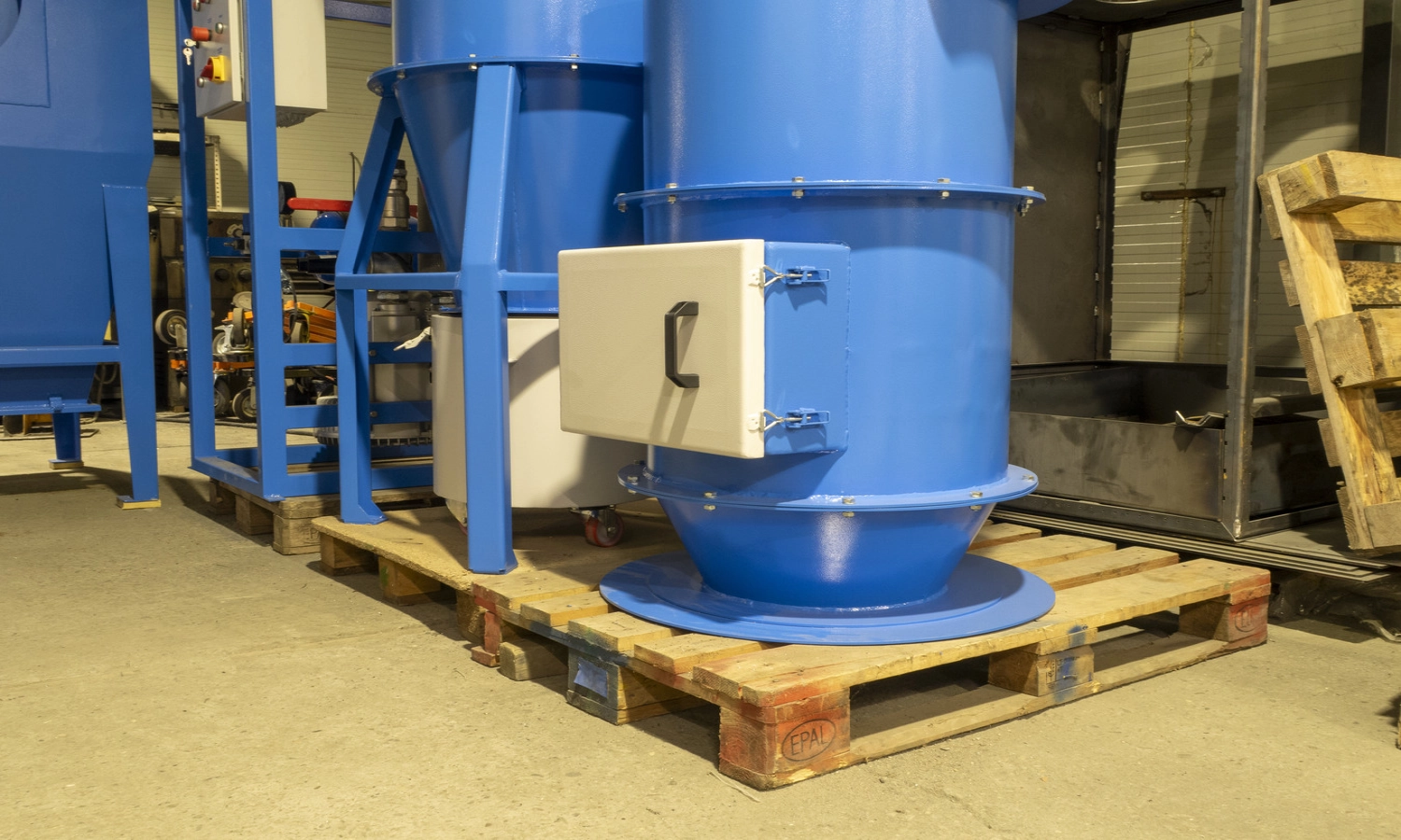 - Oddzielanie odpadów – system usuwa zanieczyszczenia, takie jak kurz, rdza, resztki powłok malarskich czy drobne ziarna ścierniwa.